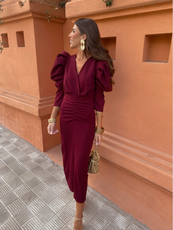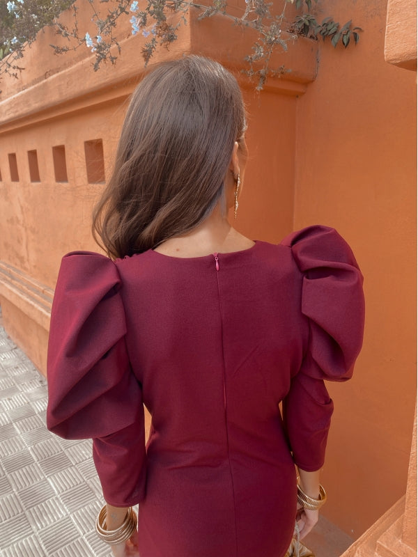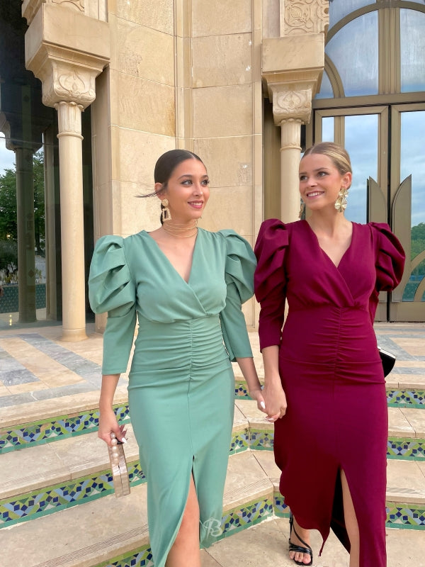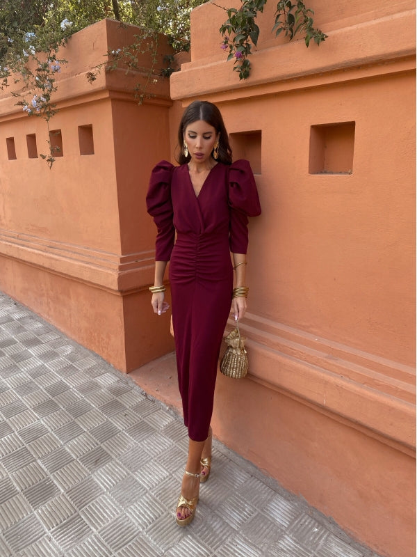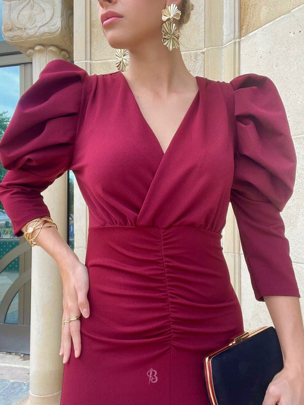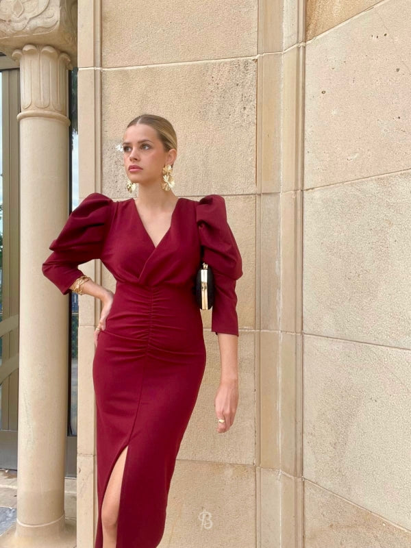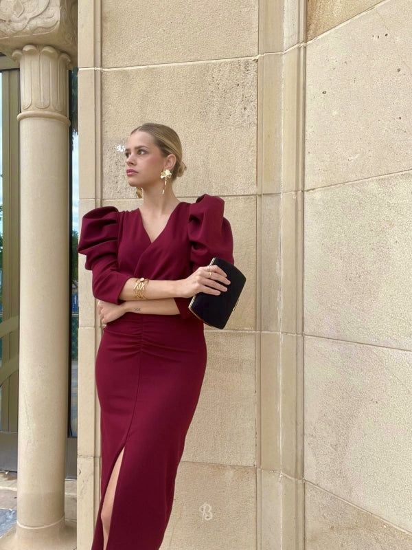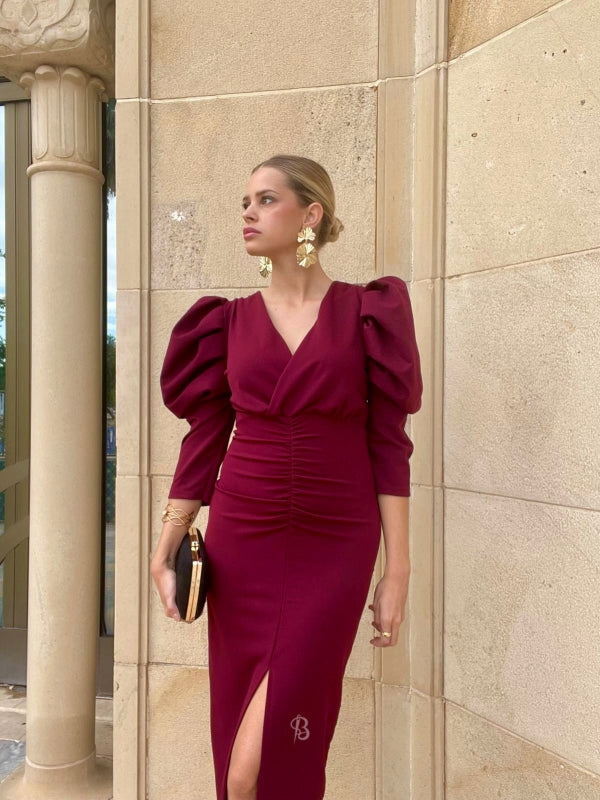 This midi dress will envelop you in sophistication and elegance with its intense maroon color. The maxi puff sleeve and crossover V-neckline of the Dragonfly guest dress create a striking visual contrast, while the front gathering and center slit slim the figure.